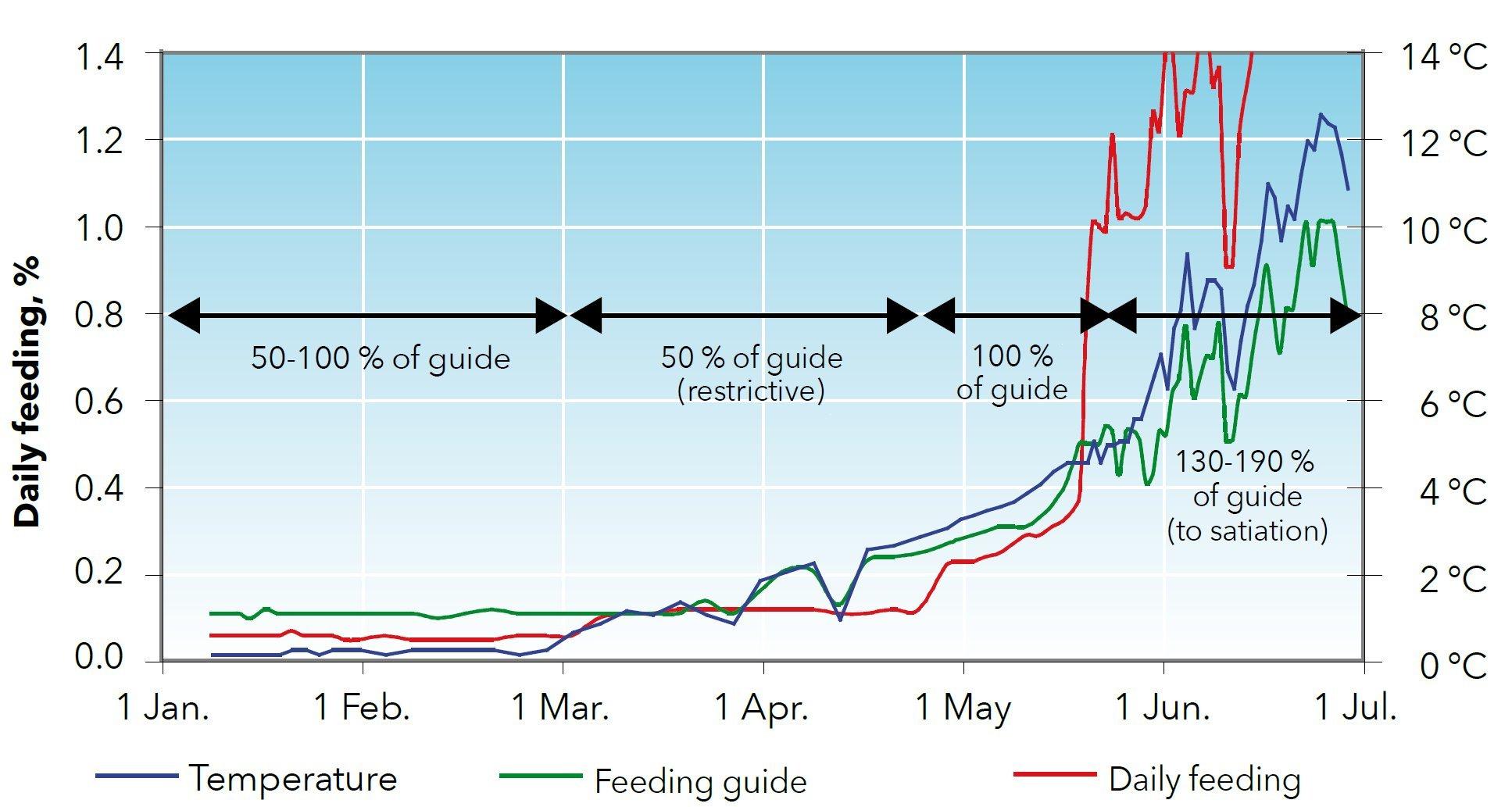 During the first weeks of spring with rapidly rising temperatures, feeding of the fish must be very restrictive due to the fact that the fish have not yet developed sufficient red blood cell capacity for transporting oxygen to all vital parts of the body.