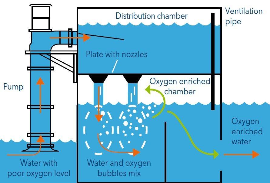 It is relevant to know that the water is not "refreshed" by the enrichment with liquid oxygen but is merely saturated with oxygen. All degassing should be completed prior to oxygenation. For this, numerous fish farms have installed an aeration column (for degassing) followed by a jet platform (for oxygenation). By this, the water is degassed prior to oxygenation and there is an extra win-win as you only need to install one pump instead of one for each single device. If both devices require a lift of 0.7 m, a propeller pump with a 1.4 m lift capacity typically has a higher efficiency than a pump that only lifts 0.7 m.