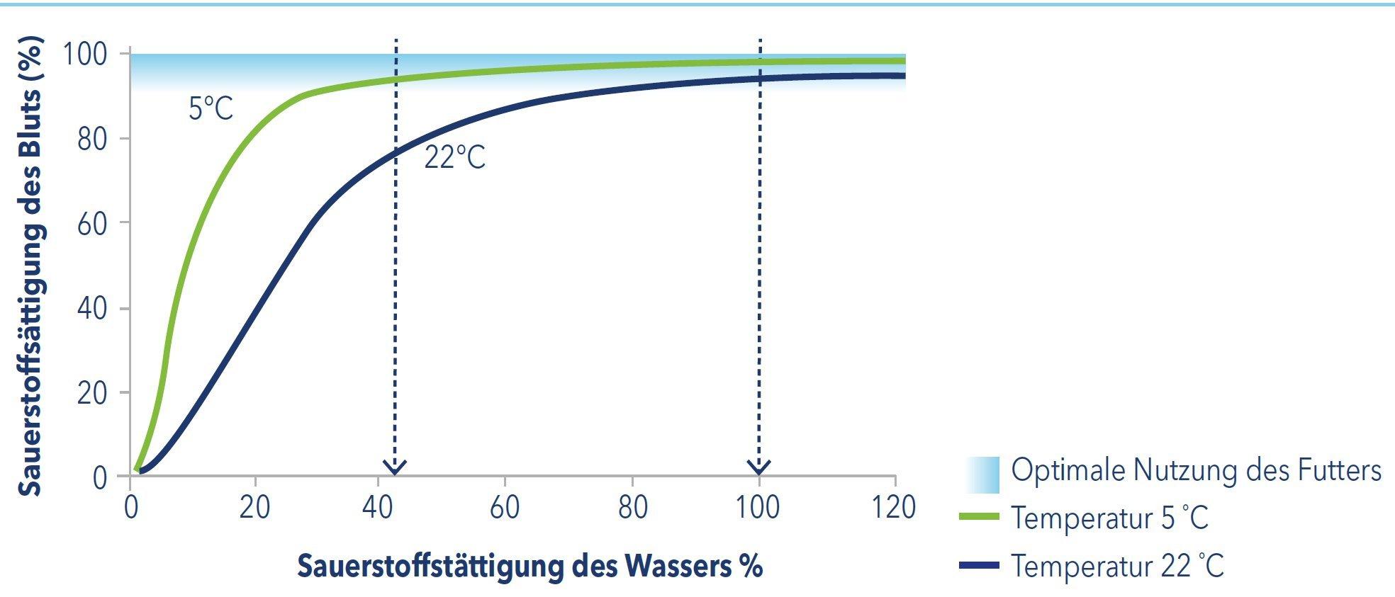 Der Sauerstoffgehalt im Wasser beeinflusst den Sauerstoffgehalt im Blut der Fische bei gegebenen Wassertemperaturen und kann einen Einfluss auf eine optimale Futterverwertung haben. Liegt die Sauerstoffsättigung des Wassers unter diesen Grenzwerten, wird die Futternutzung beeinträchtigt, mit einem Anstieg des Futterquotienten zur Folge.
