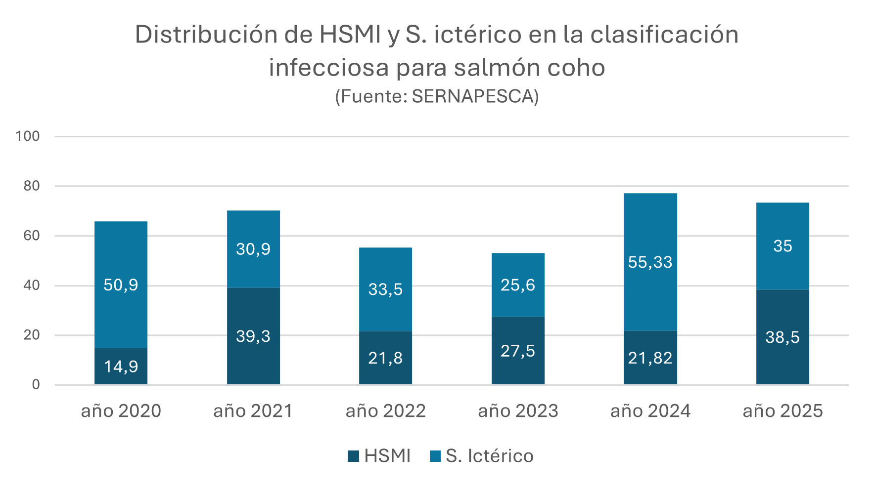 Con el tiempo la prevalencia de HSMI en el Coho ha mostrado un aumento, así como también el síndrome ictérico o ictericia que es parte de la signología de HSMI.