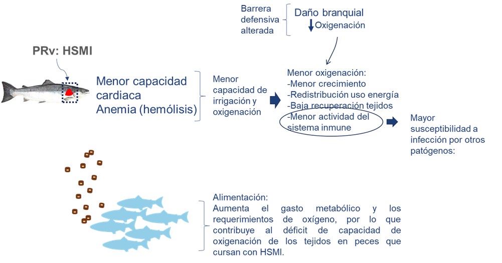 El alcance de HSMI no sólo es sanitario, sino que también compromete el desempeño productivo de los peces, especialmente debido a la menor disponibilidad de oxígeno en los tejidos, restringiendo los procesos anabólicos que son fundamentales para el crecimiento. Junto con ello, la eficiencia de conversión del alimento estará afectada negativamente. A lo anterior se suma el ayuno de los peces, como medida de mitigación de las mortalidades.