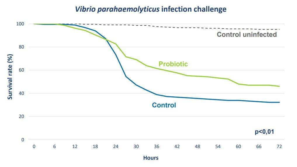 The probiotic-supplemented shrimp also demonstrated increased resistance to Vibrio parahaemolyticus infection. The survival rate was significantly higher in the probiotic group compared to the control group during the bacterial challenge (p<0.01) (Figure 2). The probiotics likely contributed to this improved resistance by competing with the pathogen for nutrients and adhesion sites, and by stimulating the shrimp's immune system.