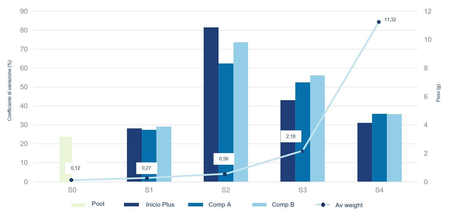 Nel test di performance alimentare, i risultati hanno mostrato che il mangime BioMar ha ottenuto il coefficiente di variazione (CV%) più basso nei punti di campionamento S3 e S4, rispetto ai prodotti concorrenti. Un basso CV% indica una crescita uniforme dell’intera popolazione, segnalando che i pesci si sviluppano in modo più omogeneo nelle stesse condizioni di allevamento.