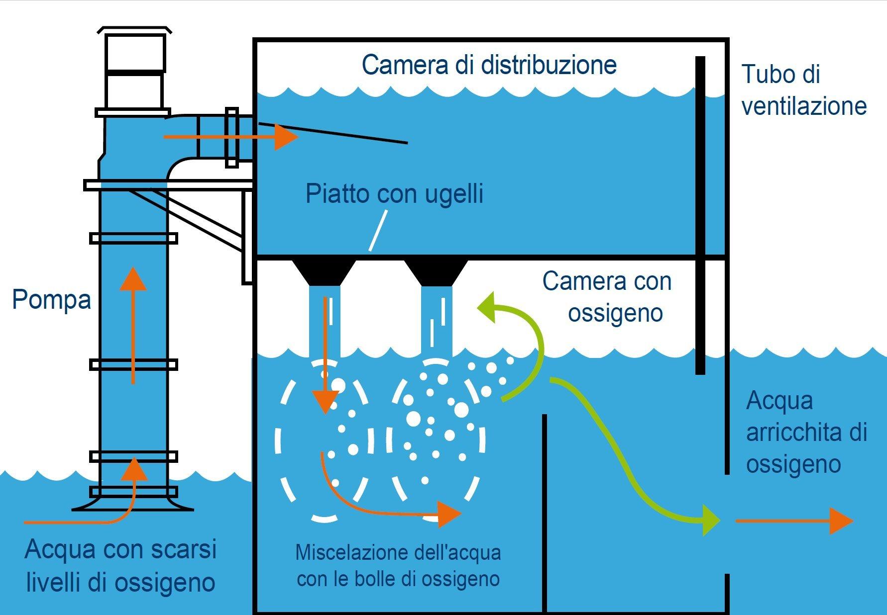 Come funziona? \ La piattaforma a getto è un metodo per l'arricchimento di ossigeno che utilizza ossigeno liquido. L’uso di ossigeno liquido è l'unico metodo che permette il raggiungimento di una saturazione di ossigeno superiore al 100 %. Le piattaforme di ossigeno possono saturare fino a circa il 180 % con un flusso massimo di circa 300 l/s. Immagine: Piattaforma a getto (sezione trasversale schematica). La piattaforma a getto è un metodo molto diffuso di arricchimento dell'ossigeno che utilizza ossigeno liquido. L'uso dell'ossigeno liquido è l'unico metodo di ossigenazione in grado di raggiungere una saturazione di ossigeno superiore al 100 %.