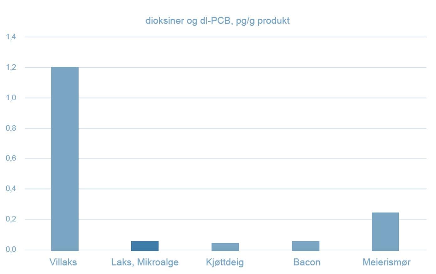 I 2018 kom EFSA med nye anbefalinger knyttet inntak av dioksiner og dioksinliknende PCB. Anbefalt maksimalt daglig inntak ble redusert fra 14 pg/g per kg kroppsvekt til 2 pg/g. I denne sammenheng rettes ofte søkelyset mot sjømat da dette er en matvaregruppe som kan ha høyt innhold av disse kontaminantene. Mens maten og byttet til villfanget fisk ikke kan kontrolleres, er dette imidlertid fullt mulig hos oppdrettslaks. Det er også slik at disse komponentene gjenfinnes i annen fettrik mat som det konsumeres mye av. Mikroalgefôrene laks ble sendt til analyse hos Eurofins sammen med andre fettrike matvarer som kjøttdeig, bacon og smør (Figur 3).