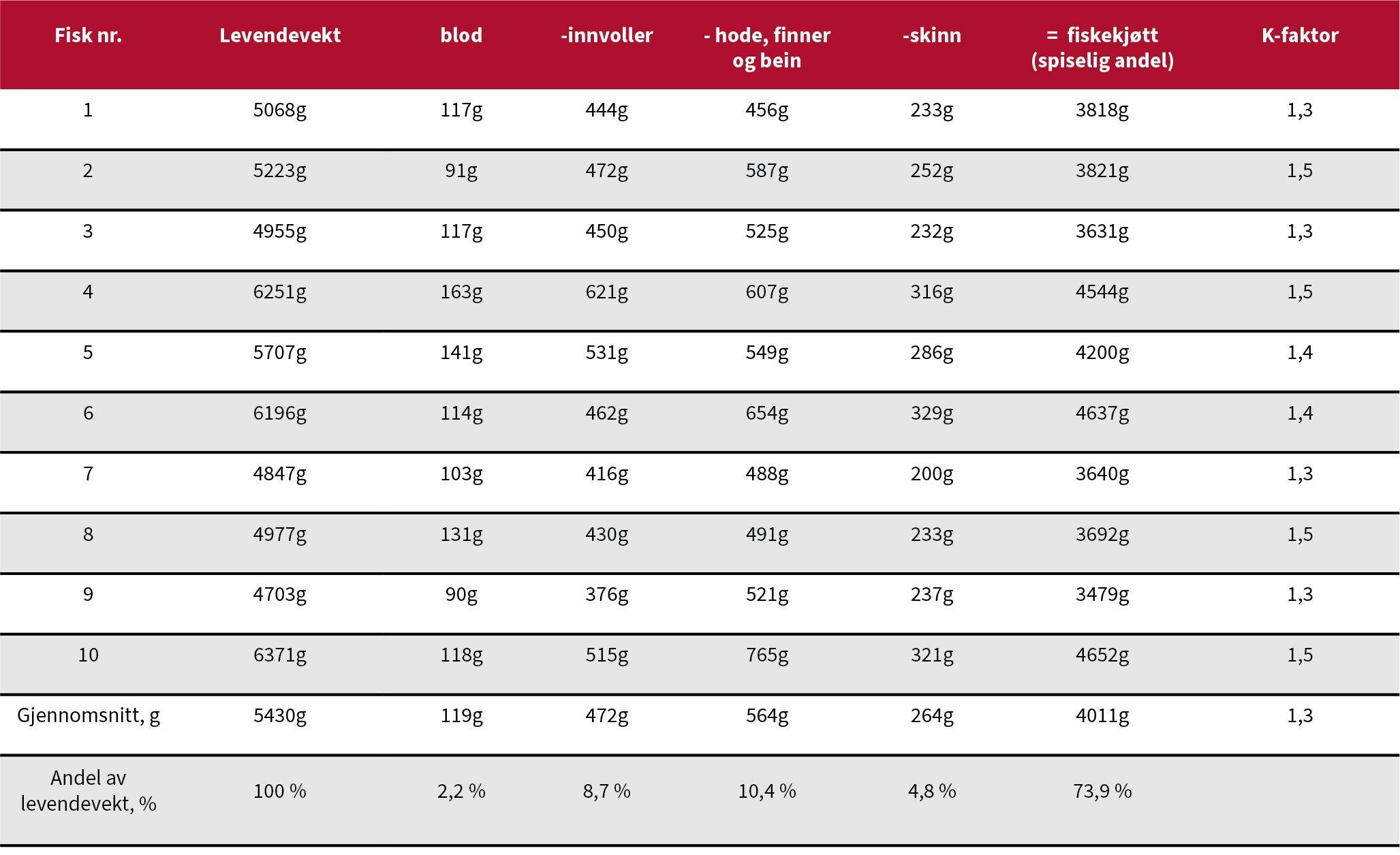 Det som regnes som spiselig andel i dette forsøket er altså fiskekjøttet. Det var liten variasjon mellom enkeltindivider selv om fiskene hadde noe varierende størrelse (4,8-6,3 kg).######