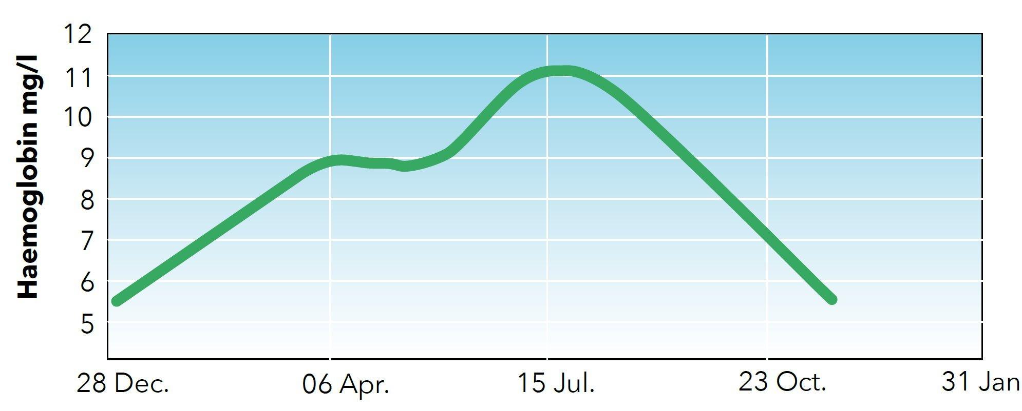 A key factor for fish well-being is to have a sufficient amount of oxygen in the muscles and other organs. The capability of getting enough oxygen depends on the number of red blood cells, i.e. the haemoglobin content, in the blood.