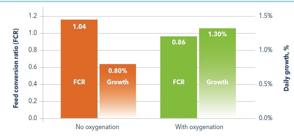 The oxygen content of water is affected by many different parameters, in particular temperature, day-night variations, air pressure, feeding, size of fish and stress levels. Economic growth rates are only possible when these variations are taken into consideration.