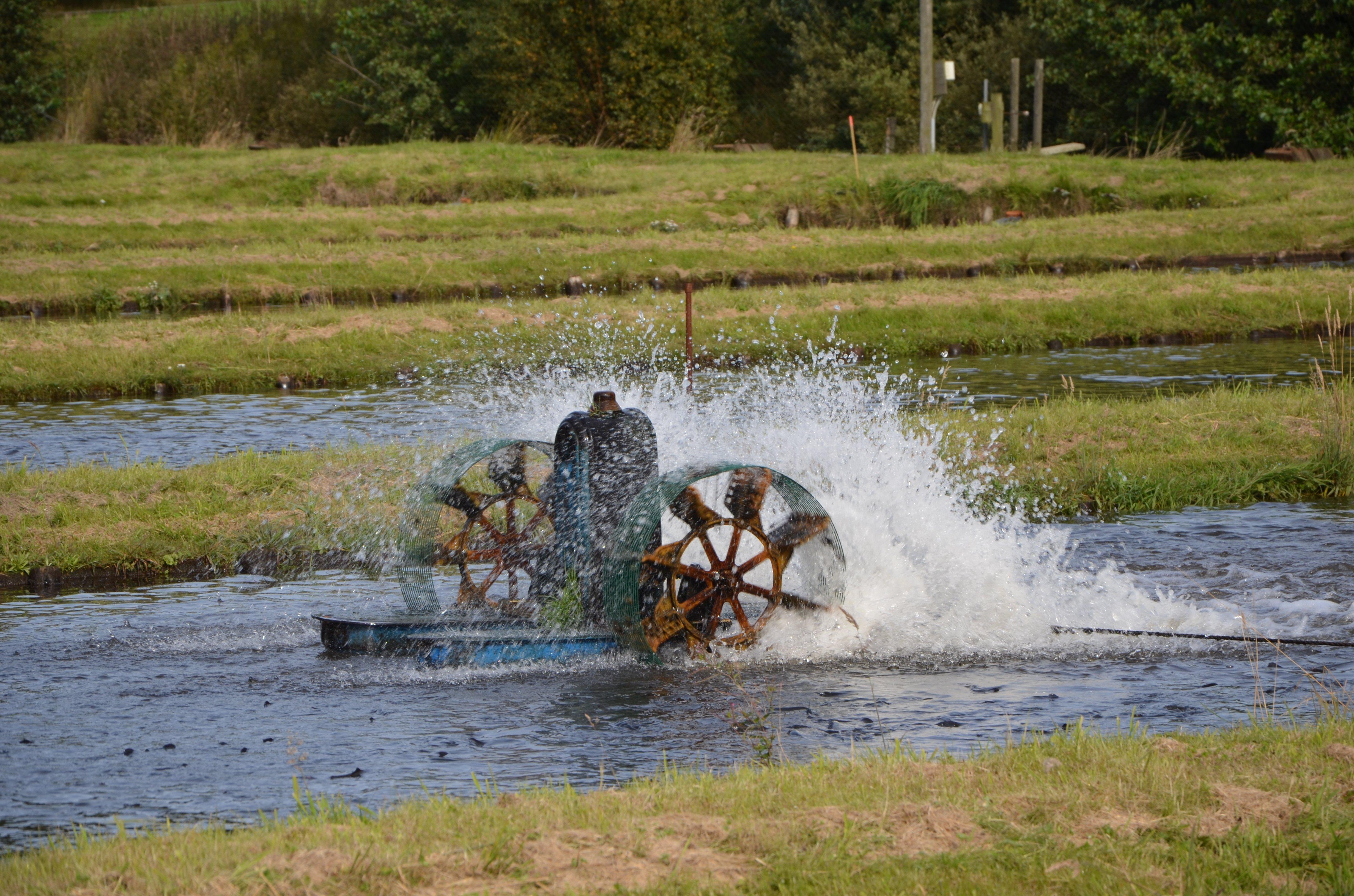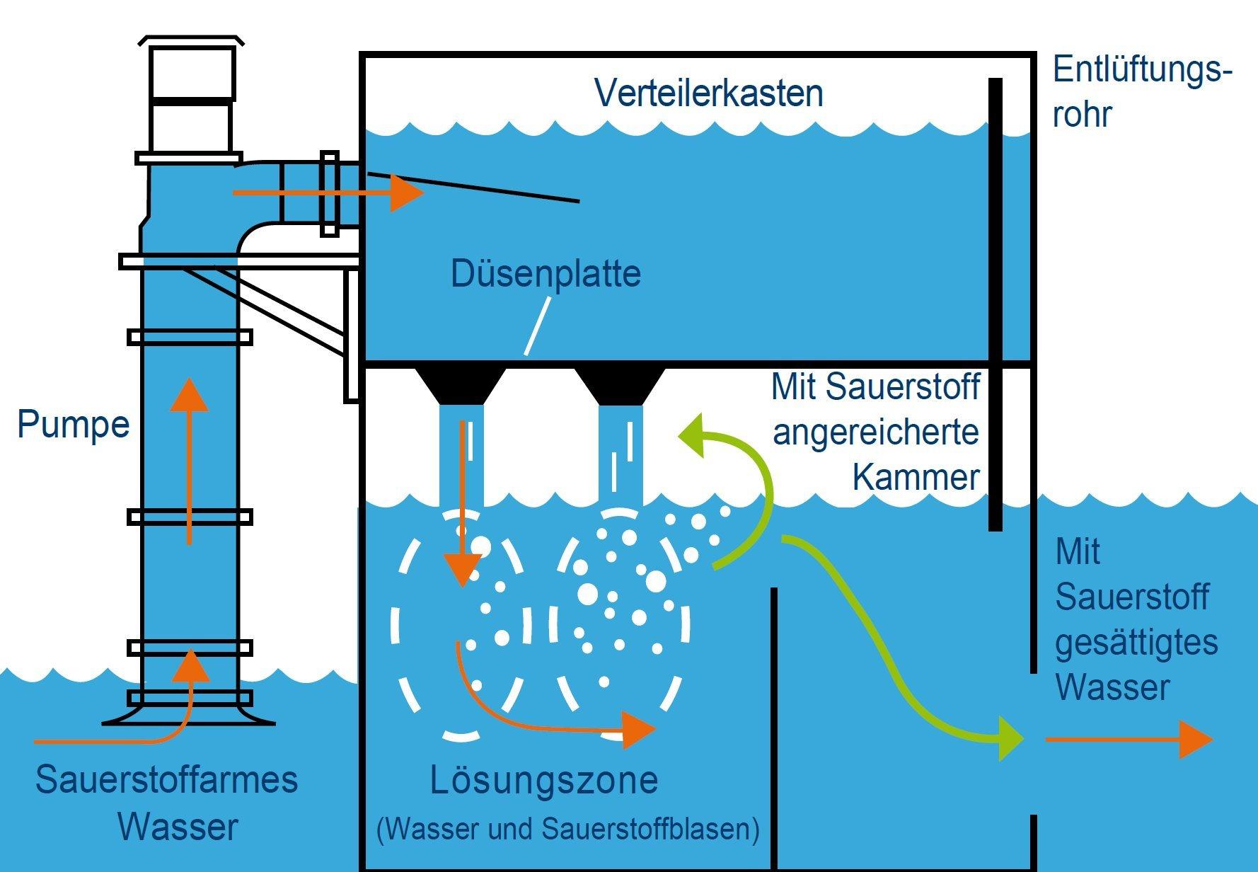 Das Wasser wird durch Luftkontakt aufgefrischt. Bei Wassertemperaturen bis ca. 15 °C kann eine maximale Sättigung von 70 % Sauerstoff erreicht werden. Darüber hinaus wird es schwierig sein, mit einem Oberflächenbelüfter den Sauerstoffbedarf für eine wirtschaftliche Fütterung sicherzustellen.