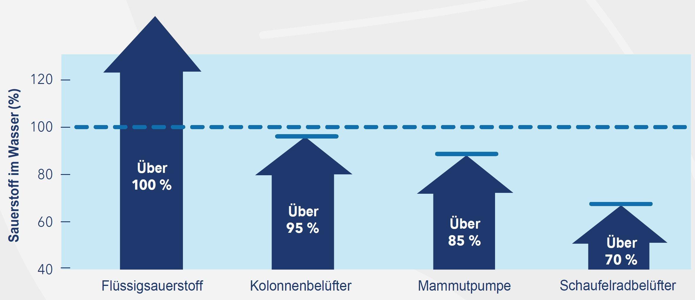 Die verschiedenen Methoden der Sauerstoffanreicherung sind mehr oder weniger effektiv und können auf weitere Gase im Wasser Einfluss nehmen. Die maximal mögliche Sauerstoffsättigung schwankt von 70 % mit einem Schaufelradbelüfter bis zu mehreren hundert Prozent mit Drucksystemen und flüssigem Sauerstoff.