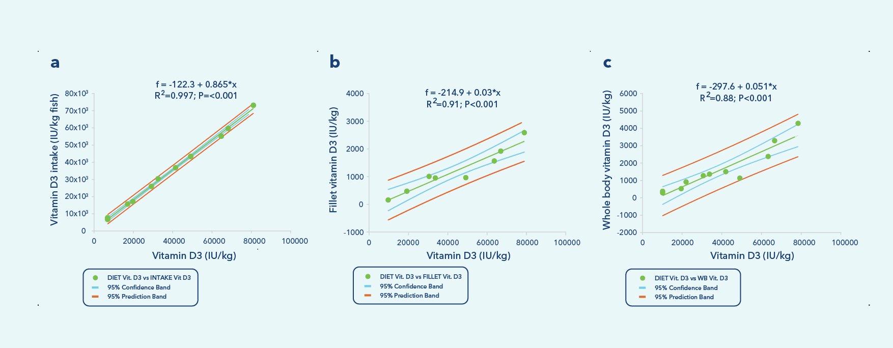 Figure 1. Regression analyses of dietary vitamin D3 (IU/kg) levels and feed intake (IU/Kg fish) (a); fillet content of vitamin D3 (IU/Kg fish) (b); whole body content of vitamin D3 (IU/Kg fish) (c). Dots represent the mean of the experimental treatments (n=2 in D1 and n=1 in the rest).