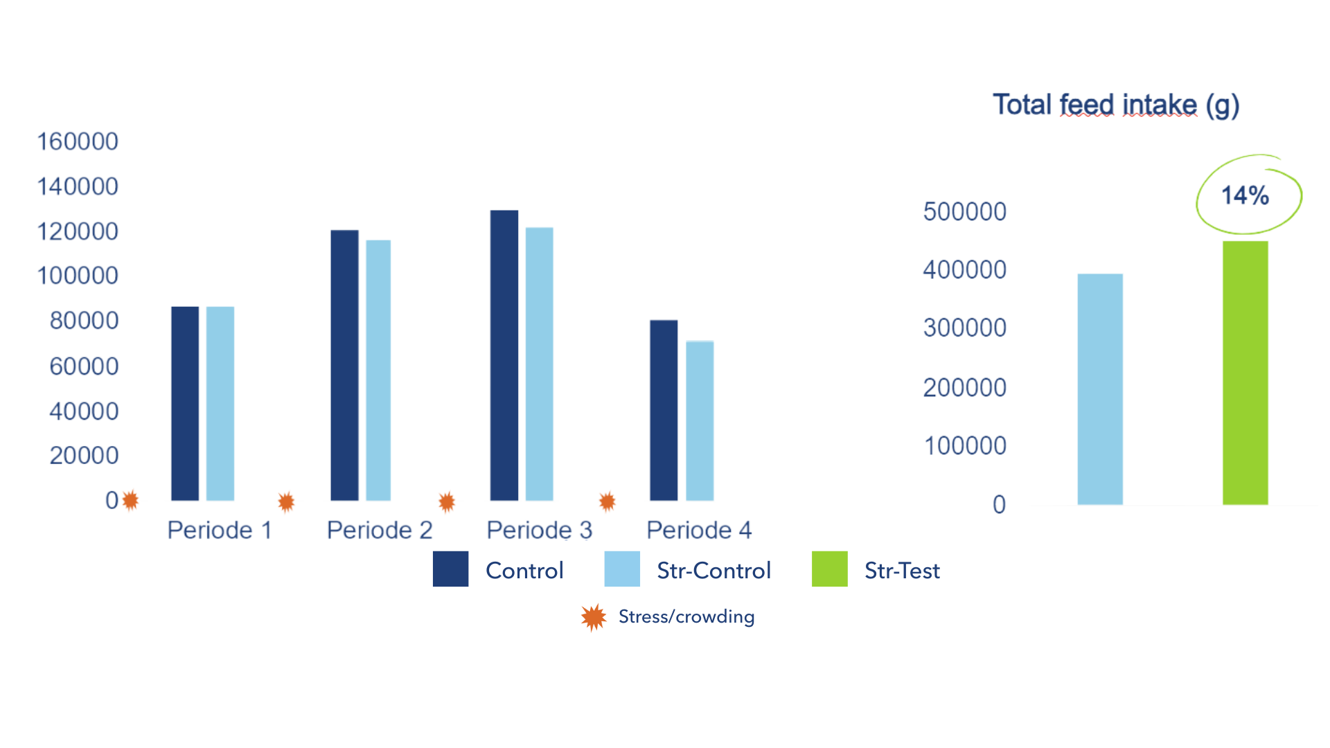 A 9-month trial was conducted at BioMar's research facility LetSea (Norway) to evaluate the efficacy of this functional feed under realistic production conditions. A challenge model simulating the delousing process was developed, involving mild crowding (1.5 hours), sedation, netting, individual weighing, and manual delousing. This procedurewas repeated four times during the trial. The experimental diet was fed for two weeks prior to each handling event and continued during the week of treatment. Atlantic salmon were followed from 1.5 kg to 4.3 kg final weight. A control feed was used in both stressed and unstressed groups for performance comparison.