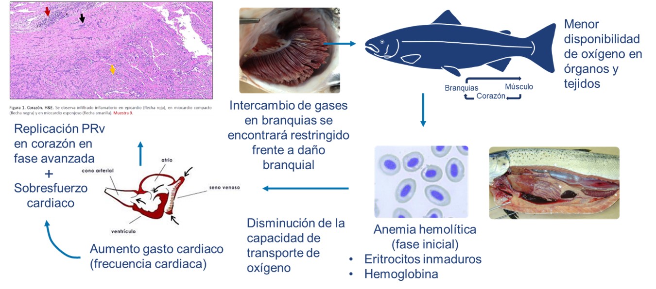 El mayor impacto de HSMI en el salmón Coho, se debe a la anemia que causa el virus PRv, en la fase inicial de la enfermedad, al infectar los glóbulos rojos y desencadenar una respuesta antiviral que conduce a la destrucción de estas células, que cumplen un papel fundamental en el transporte de oxígeno hacia los tejidos. Un mecanismo compensatorio que se activa con la anemia es el aumento de la frecuencia cardiaca y con ello el riesgo de sobreesfuerzo cardiaco y la presentación de lesiones en el corazón, se incrementan. En esta condición los peces serán mucho más susceptibles los cambios ambientales, especialmente a las fluctuaciones de oxígeno en el agua, así como también al daño branquial, y el riesgo de la presentación de mortalidades será mayor. Además, como parte de la etapa más avanzada de HSMI, el virus PRv se replica activamente en el corazón: endocardio, miocardio (estrato esponjoso) y epicardio. Estos cambios, junto con el sobresfuerzo del corazón que se produce a causa de la anemia, pueden producir disfunción cardiaca y muerte de los peces.