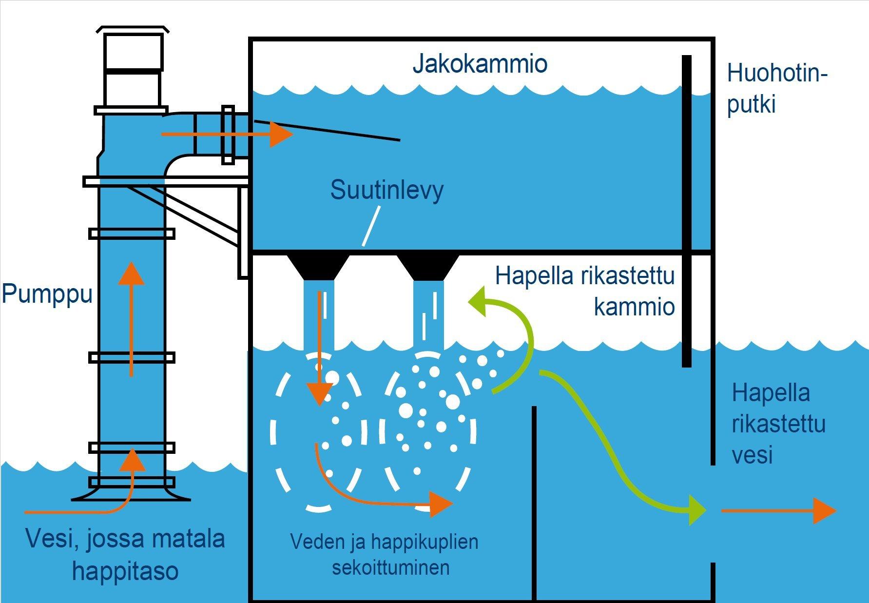 Vesisuihkut kulkevat hapella rikastetun kammion kautta ennen kuin ne osuvat veden pintaan noin 20 cm levyn alapuolella. Suihkut puhaltavat happikuplia veteen, jolloin syntyy ”kuplasumu”, joka varmistaa hapen tehokkaan sekoittumisen veteen.