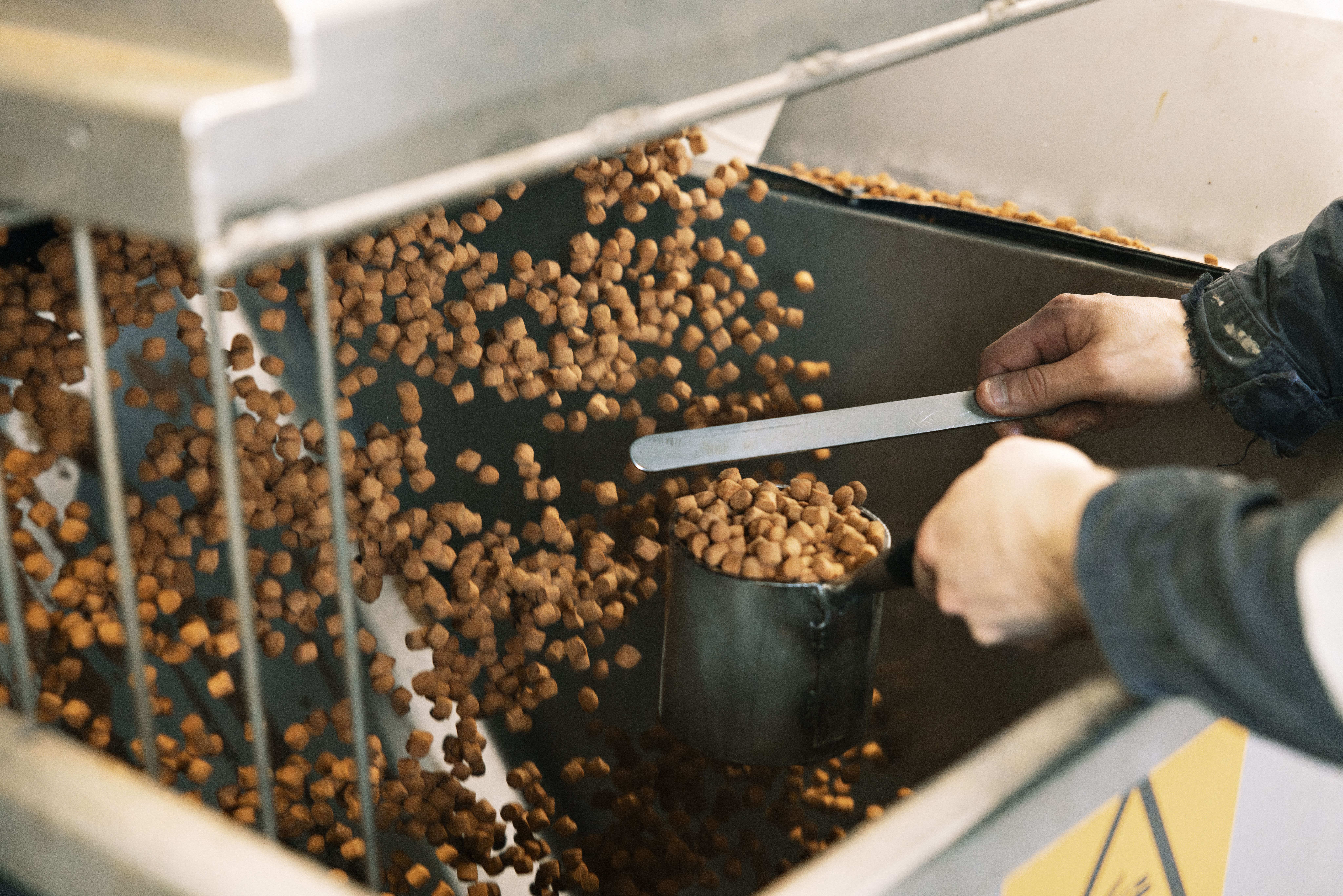 Etter ekstrudering har pelletene et vanninnhold på ca. 26 %. Dette reduseres til 5–7 % gjennom en skånsom tørkeprosess, som overvåkes nøye for å sikre jevn tørking og unngå skalltørking.