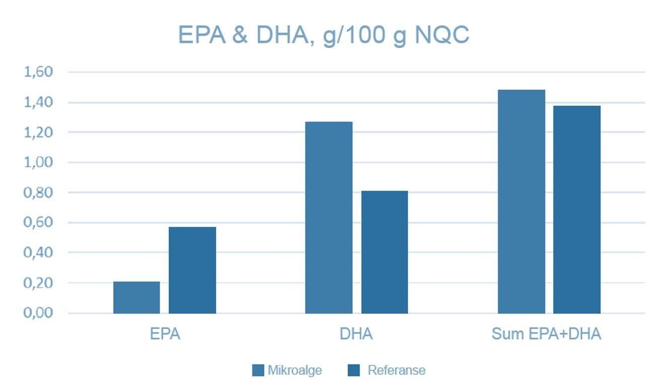 Konsentrasjonen av EPA og DHA i NQC ved forsøkets slutt viste at det var noe høyere nivå i muskel hos laks fôret med mikroalger (Figur 2). Dette skyldes trolig en noe høyere retensjon av DHA enn EPA og det bekrefter kjent kunnskap og teori. Det var likevel en god del mer EPA i NQC og fiskekjøtt (14 % av total EPA+DHA) sammenlignet med nivået av EPA fôret (6  % av total EPA+DHA) noe som tilsier at det hadde vært en viss grad for retrokonversjon. Dette er også vist i kontrollerte småskalastudier der man har fôret fisk med DHA som eneste kilde til langkjedede omega-3.