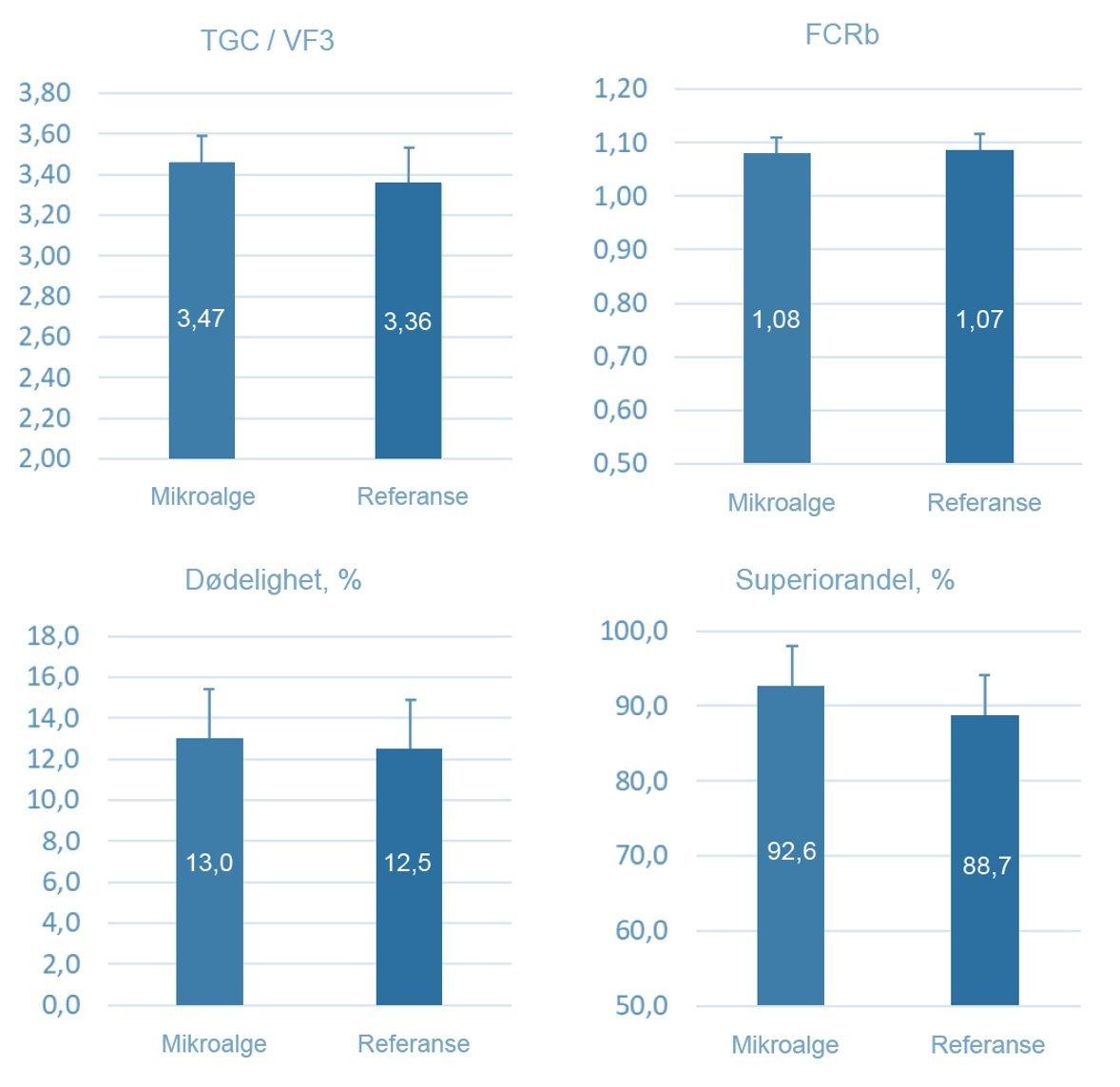 Figur 1. Produksjonsdata fra forsøket. Vekstfaktor (VF3), biologisk fôrfaktor, dødelighet og superiorandel hos laks som har fått mikroalger vs. fiskeolje som kilde til langkjedede omega-3