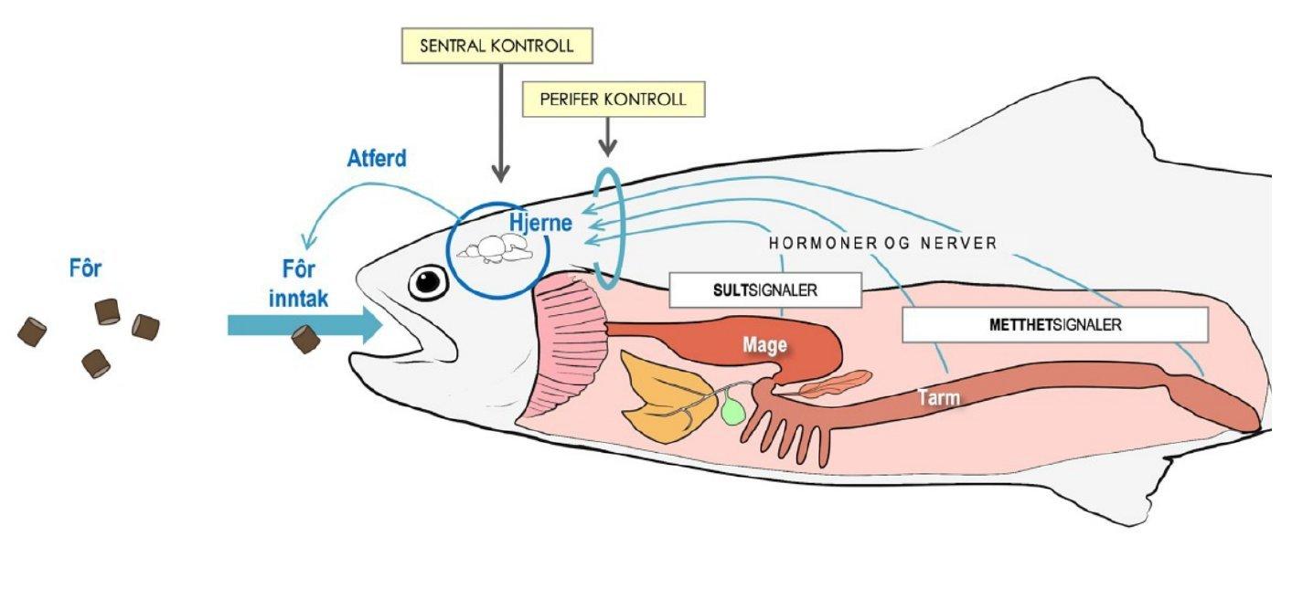En effektiv fordøyelse er grunnlaget for at fôret kan utnyttes av fisken. Fordøyelsesprosessen styres av et komplekst system av nerver og hormoner som koordinerer bl.a. frisetting av enzymer og forflytning av fôret ettersom det fordøyes og absorberes. Hormonene og nervene i mage-tarm systemet overfører også viktig informasjon til hjernen som styrer appetitt og fôrinntak (Figur 1). Ghrelin er et viktig hormon (signalstoff) som bl.a. utskilles av mage og påvirker aktiviteten i magesekken og som muligens også kan stimulere fôrinntak (orexigen) hos fisk, samt at det påvirker energiomsetning og frisetting av veksthormon. Vi klarte ikke å påvise noen forskjeller i genuttrykk av ghrelin mellom diettene, men vi så gjennomgående at den ene genvarianten (laks har to varianter av dette genet, vi mennesker har ett), ghr/1, var betydelig høyere uttrykt enn ghr/2, noe som kan tyde på at ghr/1 er viktigst for laksen. Vi analyserte nivå av genuttrykk av flere andre hormoner i ulike deler av tarmen, som vi antar har nøkkelroller i å regulere fordøyelsen hos laks.Ulike varianter av pyy- og gcga i midtarm og baktarm kan trolig brukes som biomarkører for fordøyelsesfunksjon og som vi antar også er involvert i kontroll av appetitt. Det antas at både pyy-paralogene og gcga bremser fordøyelsesprosessen og stimulerer fiskens metthetsfølelse (anorexigen), mens gcga i tillegg er involvert i regulering av insulin og glukose homeostase. Uttrykket av pyyal, pyya2 og gcga i midttarm var betydelig høyere enn de samme genene i baktarm. Dette er interessant og motsatt av det en ser i pattedyr inkludert mennesker, og kan tyde på at metthetssignal i fremredel av tarmen er viktigere hos laks, eller at laks har en mer nøyaktig eller raskere feedback-mekanisme enn pattedyr. Vi så også at nivå av pyya2 oggcga var betydelig høyere enn pyybl i midttarmen. Vi klarte ikke å påvise hvordan disse faktorene påvirker det dynamiske samspillet som vi vet foregår mellom ulike mage-tarmavsnitt som en del av fordøyelsesprosessen. Datamaterialet gir en viss innsikt i regulering av fordøyelsesprosessen hos laks, men trolig var forskjellene mellom diettene for små til at det påvirket styringen av fordøyelsesprosessen. Gjennom dette prosjektet har vi etablert referanseverdier i tarm-hjerne aksen for status av ulike genuttrykk hos atlantisk laks som har god appetitt og vokser godt.