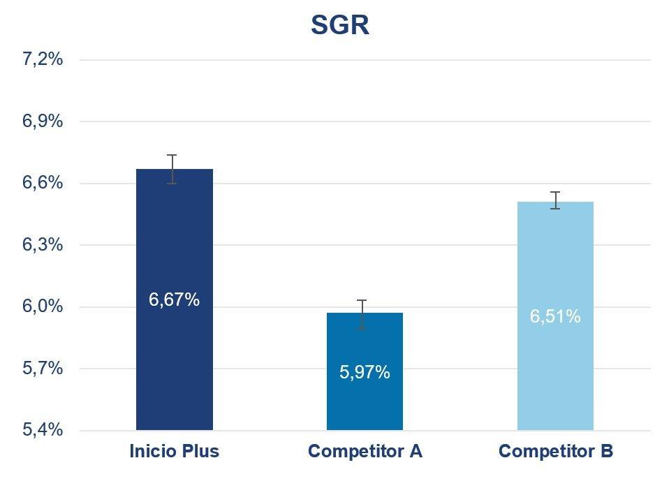 Szybkość wzrostu ryb jest zazwyczaj mierzona za pomocą SGR (ang. Specific Growth Rate) – wskaźnika specyficznego tempa wzrostu, który podaje dzienny przyrost masy ryb w procentach. SGR ma krytyczne znaczenie w akwakulturze, ponieważ szybki przyrost masy jest bezpośrednio związany z wydajnością i opłacalnością produkcji. Osiągnięcie maksymalnego tempa wzrostu jest jednym z głównych celów hodowców komercyjnych. Szybki przyrost masy i osiągnięcie wagi rzeźnej pomaga ograniczyć wydatki na energię i paszę w cyklu produkcyjnym. Ryby karmione paszą INICIO Plus wykazały znacząco wyższy wskaźnik specyficznego tempa wzrostu w porównaniu do ryb otrzymujących paszę od innych producentów dostępnych na rynku.